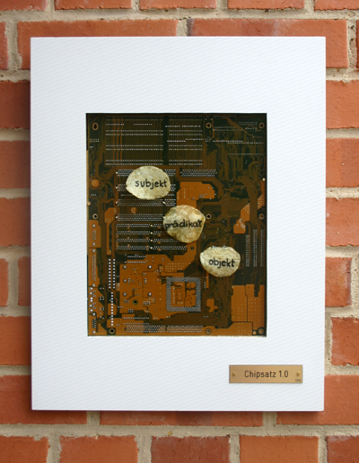 Titel: Chipsatz 1.0Detail: ![]() Platine P/I XP55T2P4 in Spanholzplatte 40 x 51 cm Kartoffelchips, Kleber, Lackfarbe © April 2016 |
